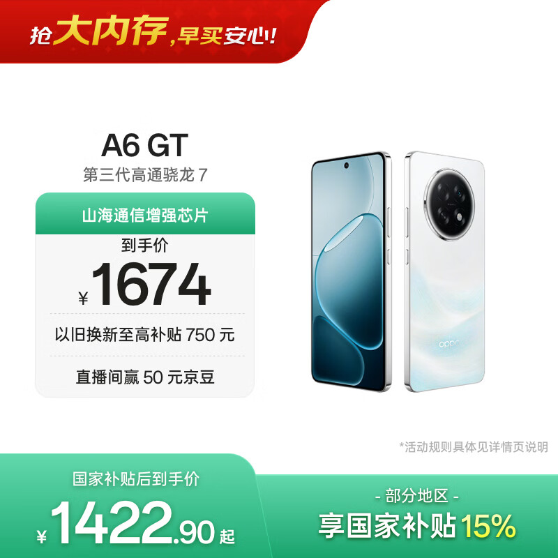 OPPO A6 GT 12GB+256GB 流光白 IP69防水 抗摔耐用流畅 5G智能手机 长续航 骁龙 自营正品 国家补贴