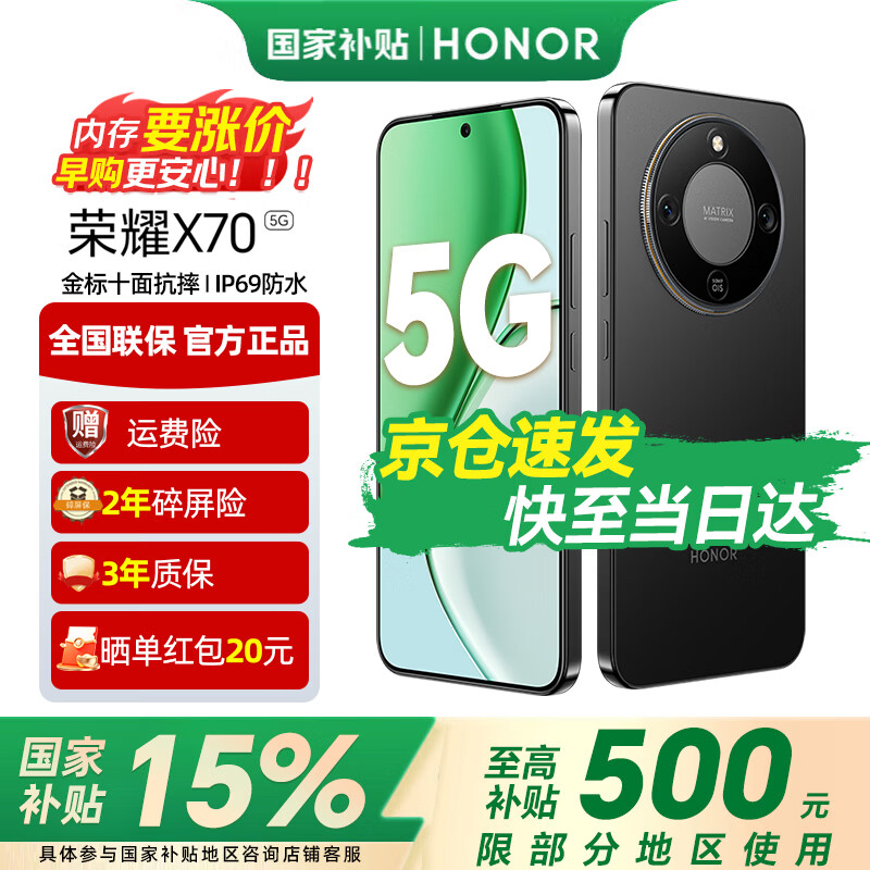 荣耀X70 【国家补贴15%】 金标十面抗摔 8300mAh青海湖电池 IP69防水 新品5G手机 幻夜黑 12GB+256GB【2年碎屏险+3年质保】 官方标配