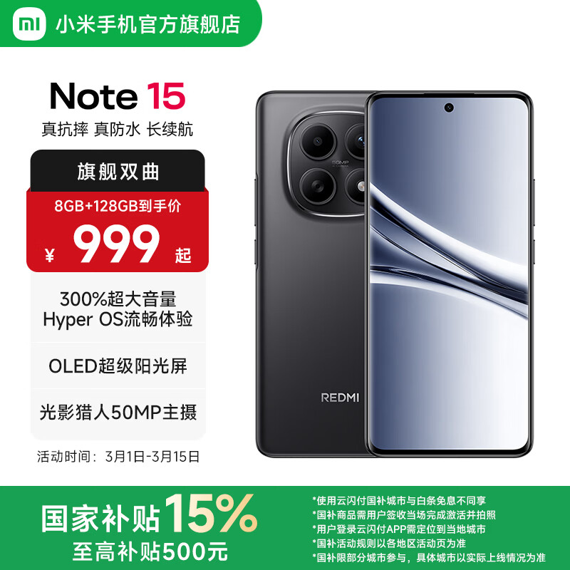 小米(MI)REDMI Note15 5G智能手机 OLED双曲面屏 第三代骁龙6处理器 IP66生活防水 红米新一代小金刚note15 子夜黑 8GB+128GB 官方标配