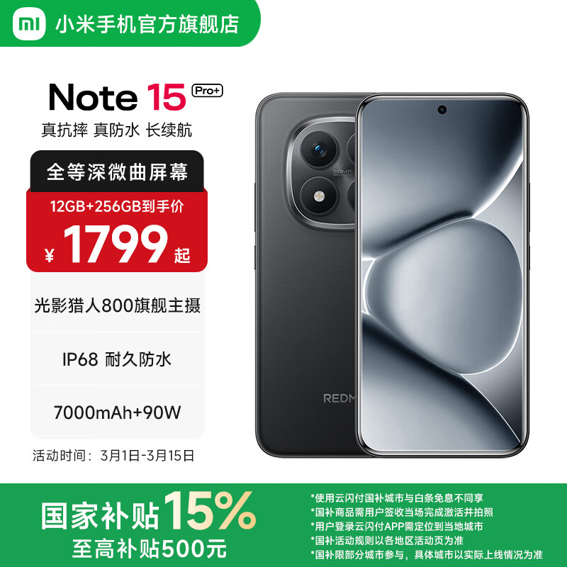 小米Redmi Note15 Pro+ 5G手机 6.83英寸第四代骁龙7s 7000mAh IP68防水 拍照手机红米手机note15pro+ 子夜黑 16GB+512GB 北斗卫星版