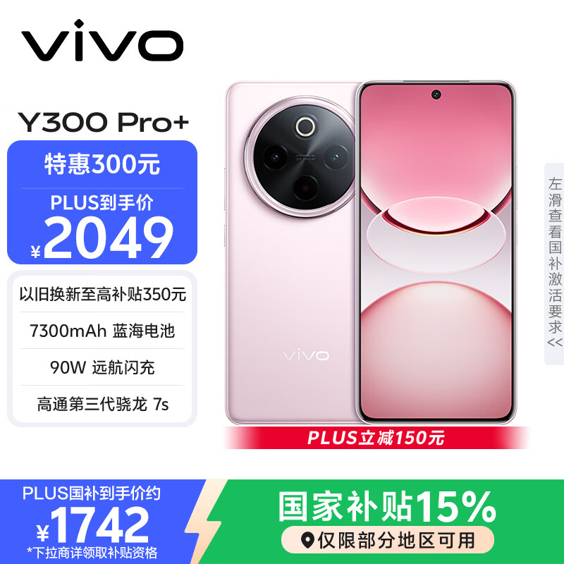 vivo Y300 Pro+ 12GB+512GB 微粉 国家补贴 7300mAh蓝海电池 第三代骁龙7s 金刚磐石架构 AI手机