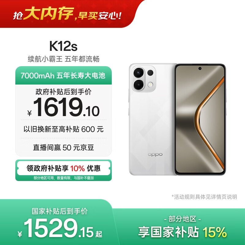 OPPO K12s 12GB+512GB 星芒白 7000mAh长续航大电池 OLED 直屏 骁龙学生 5G游戏千元新款手机 国家补贴