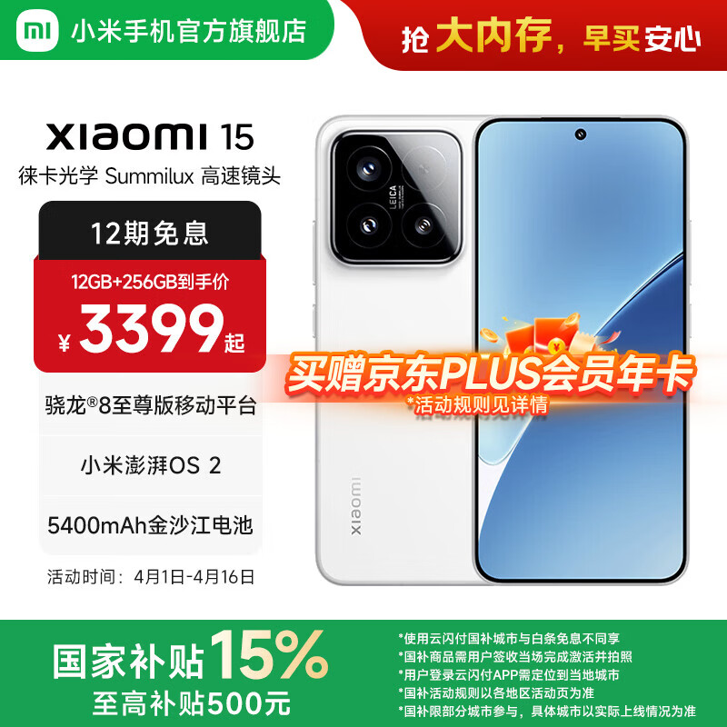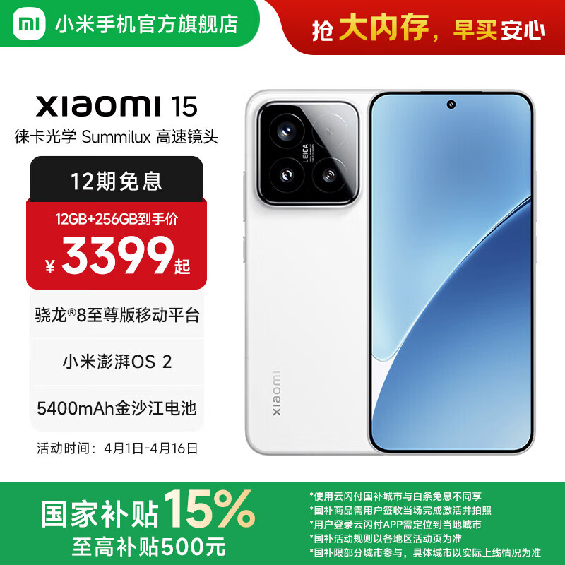 小米xiaomi小米15手机 国家补贴 徕卡光学Summilux高速镜头 骁龙8至尊版移动平台 小米澎湃OS 2 白色 12GB+256GB