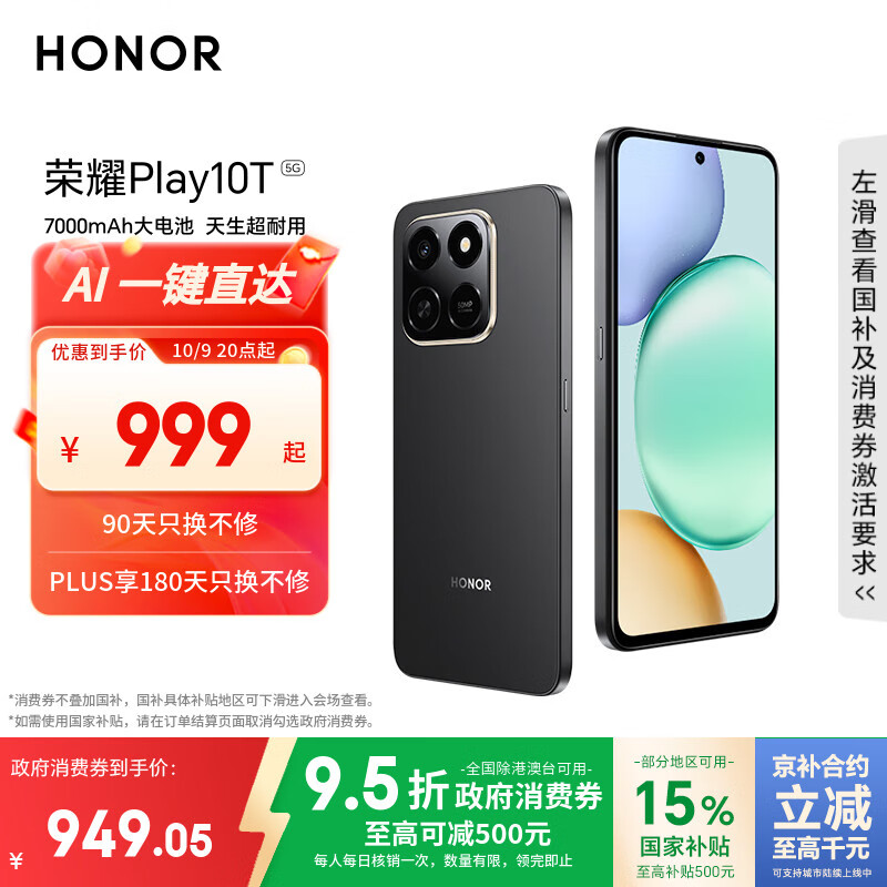 荣耀Play10T 5G AI手机 7000mAh大电池 金标抗摔超强防水 AI 一键直达 8+128 幻夜黑