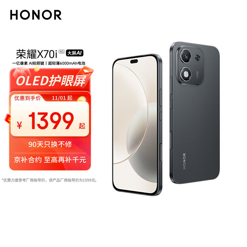 荣耀X70i 一亿像素 AI拍照键 大屏AI 高亮OLED护眼屏 超轻薄 银发人群 8+256 绒黑色 5G手机 国家补贴