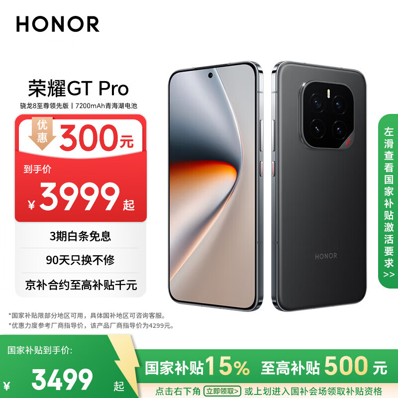 荣耀GT Pro 16+512 幻影黑 骁龙8至尊领先版 7200mAh青海湖电池 荣耀绿洲护眼屏 5G AI手机
