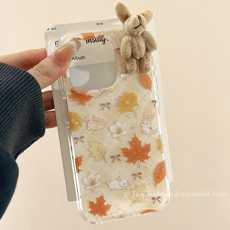 秋冬氛围感枫叶兔子公仔适用苹果17promax手机壳iPhone16Pro新款15可爱14pro防摔15pro小众13女17pro网红全包