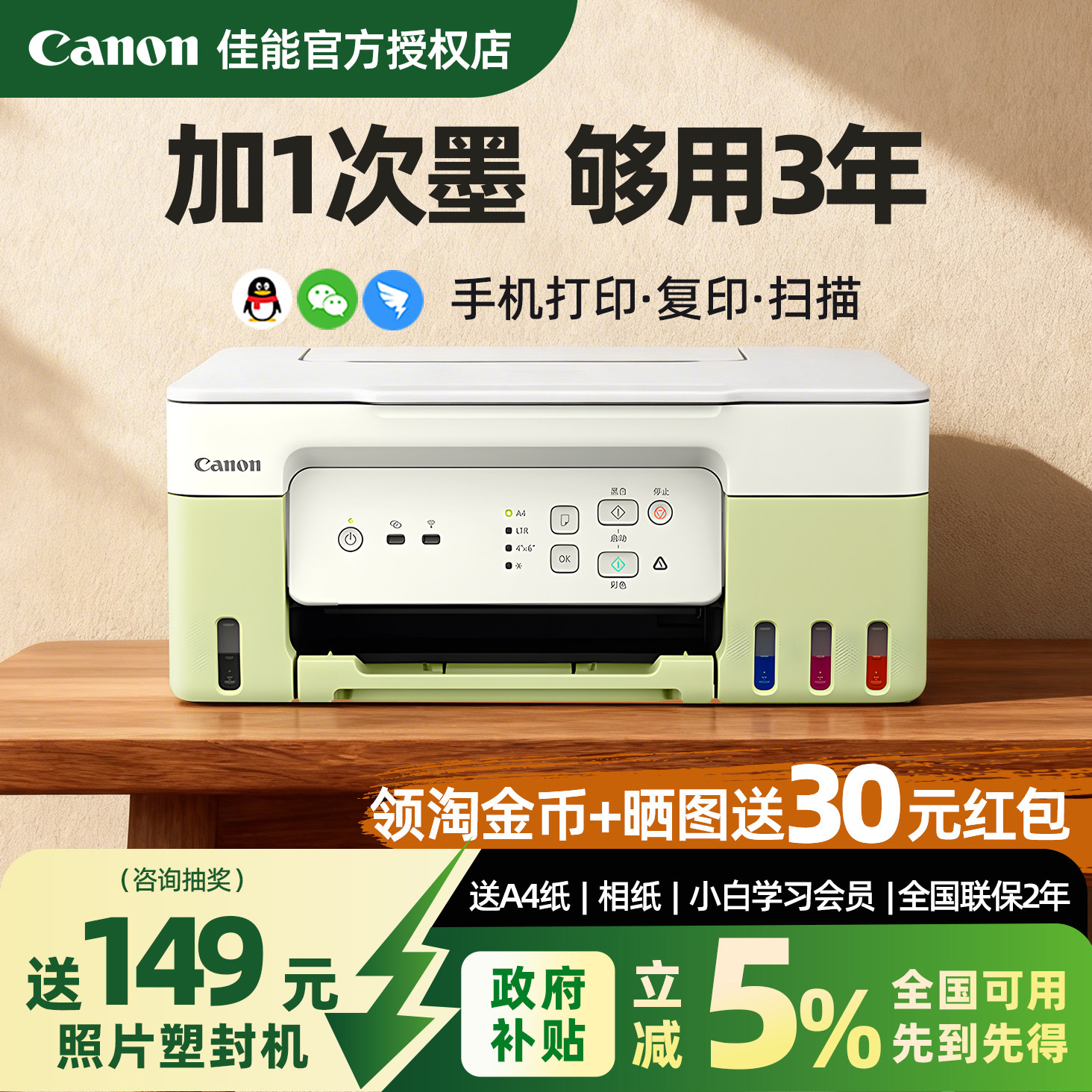 佳能G3836彩色墨仓式打印机复印扫描一体机连供家用小型可连手机无线学生作业照片家庭办公专用政府补贴G3832