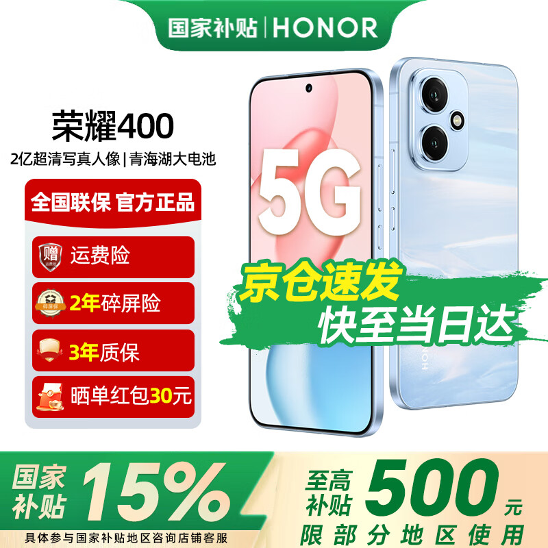 荣耀400 【国家补贴15%】2亿超清写真人像 7200mAh青海湖大电池 新品5G手机 海风蓝 12GB+512GB【2年碎屏险+2年延保】 官方标配【国家补贴15%】