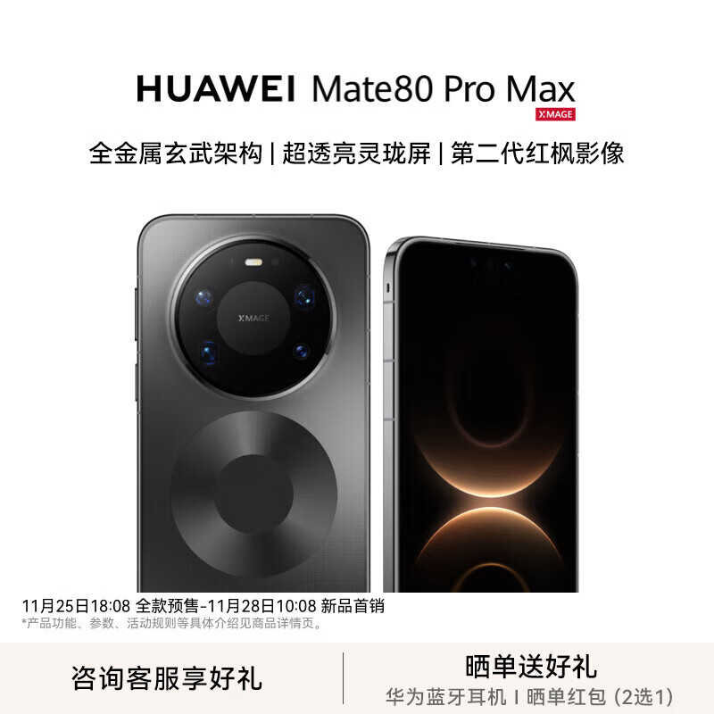 HUAWEI Mate 80 Pro Max 旗舰手机Ai 华为mate80promax手机 鸿蒙6.0 红枫原色影像 旗舰产品 官方正品 极夜黑 16GB+512GB 赠碎屏险 全国联保