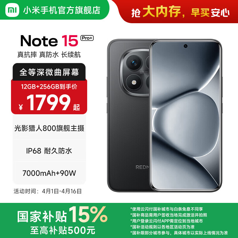 小米Redmi Note15 Pro+ 5G手机 6.83英寸第四代骁龙7s 7000mAh IP68防水 拍照手机红米手机note15pro+ 子夜黑 12GB+256GB