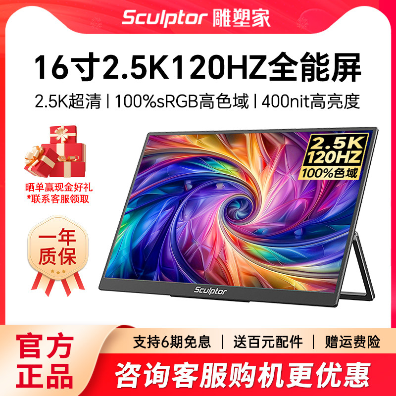 雕塑家2.5K16寸便携显示器笔记本电脑switch手机PS5扩展副屏分屏