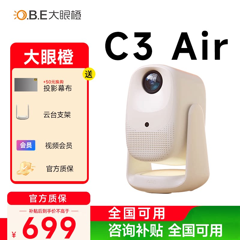 大眼橙C3 Air投影仪高亮家用高清小型便携移动迷你露营户外家庭影院房间卧室宿舍智能手机投屏投影机c3air