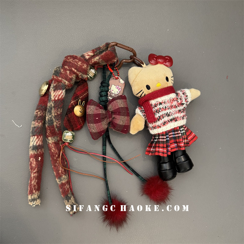 格子蝴蝶结红色圣诞节格子车钥匙扣手机壳链条书包包包挂饰耳机套