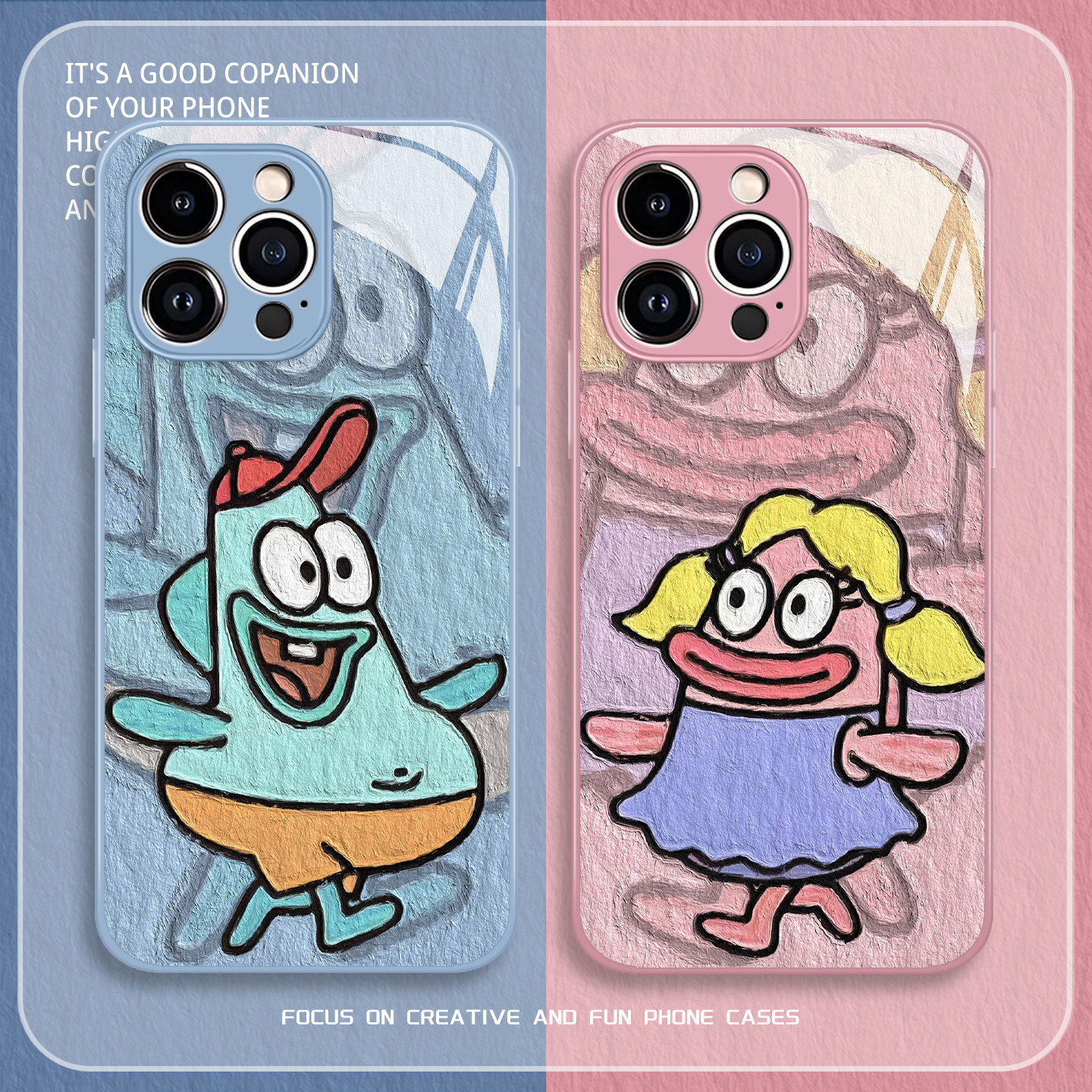 比奇堡丑鱼情侣手机壳适用苹果17promax卡通16e趣味iphone15玻璃14/13pro/12mini/11新款x/8plus/xr/xs/7/air