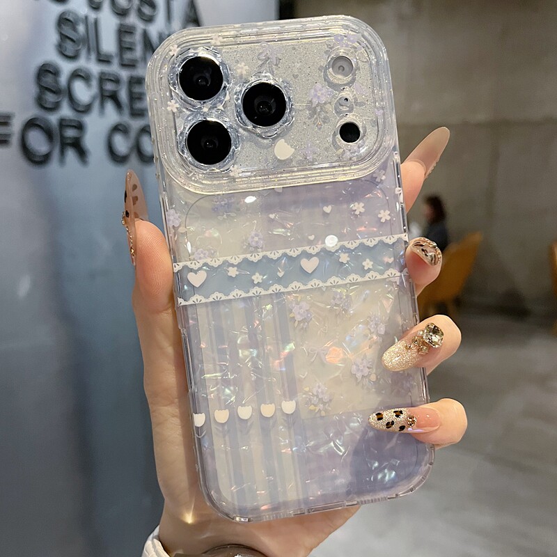 适用苹果系列iPhone17新款手机壳13pro/16promax清新紫色彩贝拼格15pro/14promax全包闪粉花朵镜框网红保护套