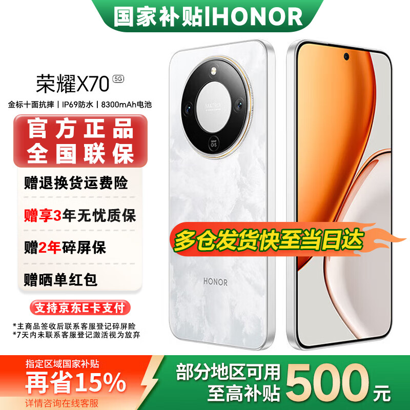 荣耀X70 【国家补贴15%】 金标十面抗摔 8300mAh青海湖电池 IP69防水 新品5G手机 月影白 8GB+128GB【2年碎屏险+3年质保】 官方标配