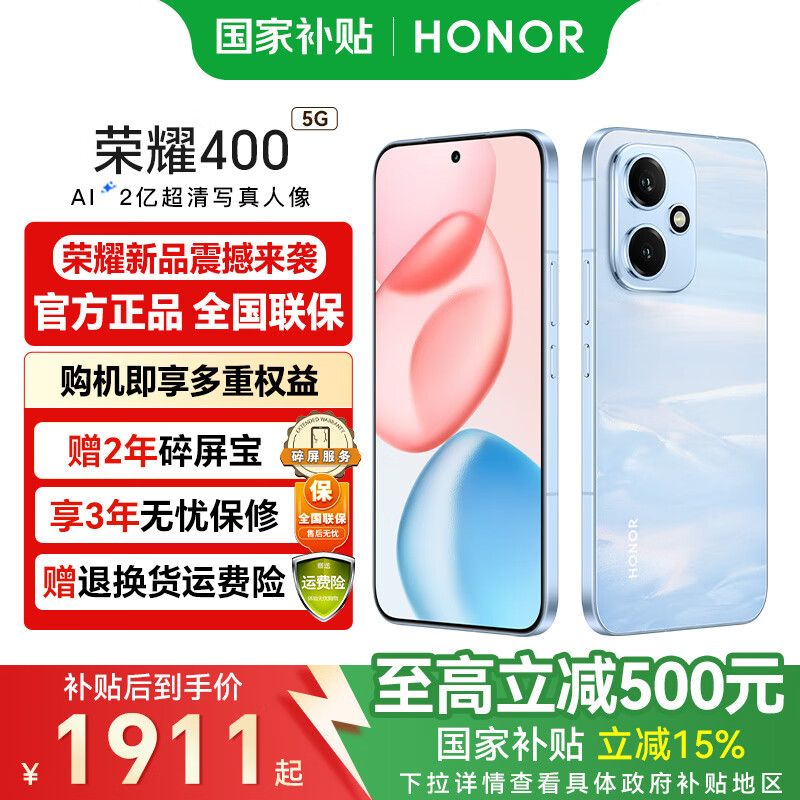 荣耀 400 【国家补贴15%】 新品 5G手机 海风蓝 12GB+512GB 官方标配