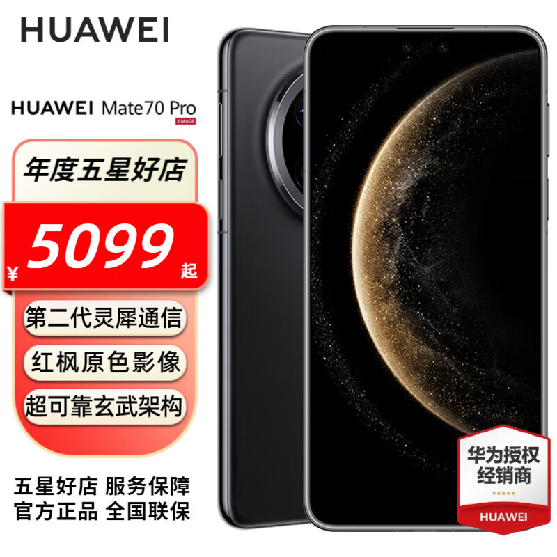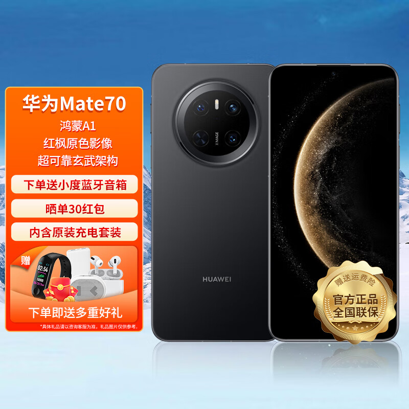华为手机华为 卫星通信手机70 X 24期免息 支持NFC 大电池长续航 地震预警 五星抗跌耐摔 双曲屏 Mate 耀金黑【512GB】 蓝牙套装版丨3年质保+180天只换不修+碎屏险