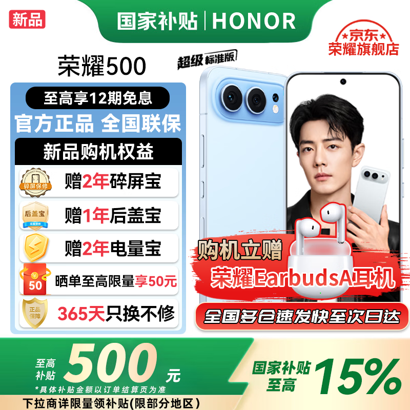 荣耀(HONOR)500 【肖战同款】新品5G手机 超级标配版 2亿人像全能实况 海蓝宝 12GB+512GB【2年碎屏险】 官方标配