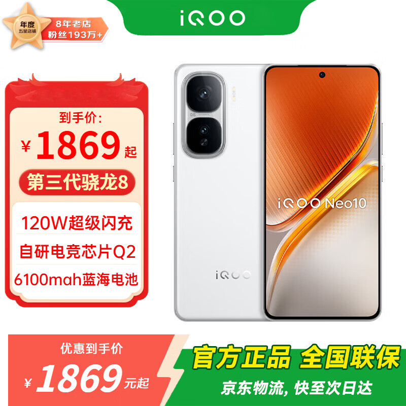 vivo iQOO Neo10 第三代骁龙8 自研电竞芯片Q2 120W快闪充薄AI新品5G手机【GB专享】 驰光白16+512GB全网通 官方标配