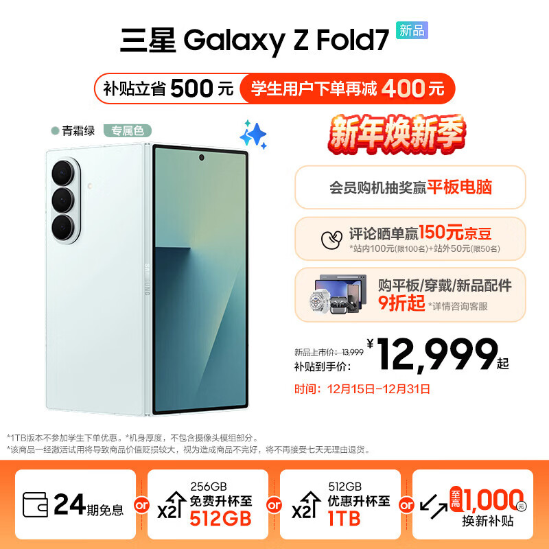 三星(SAMSUNG)Galaxy Z Fold7 超轻薄8英寸大屏2亿像素主摄 超视觉引擎 Galaxy AI 披荆斩棘哥哥同款 折叠屏手机 【专属色】青霜绿 12GB+512GB 256GB免费升杯至512GB