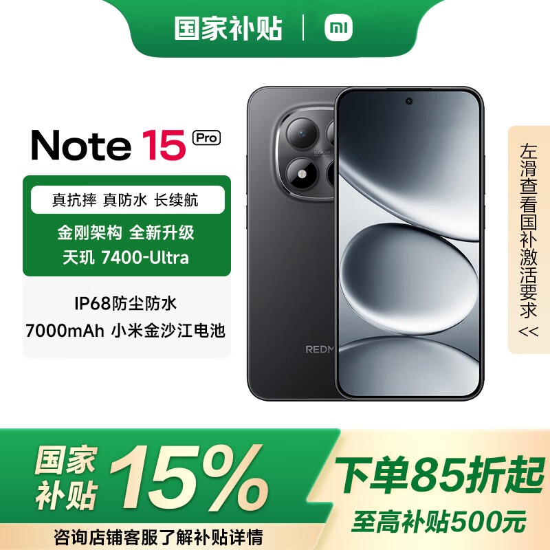 小米(MI)REDMI Note15 Pro【国家补贴】 天玑7400-Ultra 7000mAh 龙晶玻璃十倍抗摔 新品5G手机 子夜黑 8G+256G