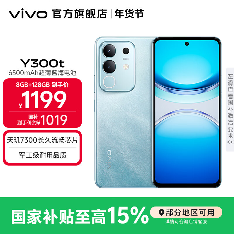 vivo Y300t 手机 6500mAh超薄蓝海电池 天玑7300长久流畅芯片 磐石抗摔结构 军工级耐用品质 拍照 手机 海蓝 8GB+256GB