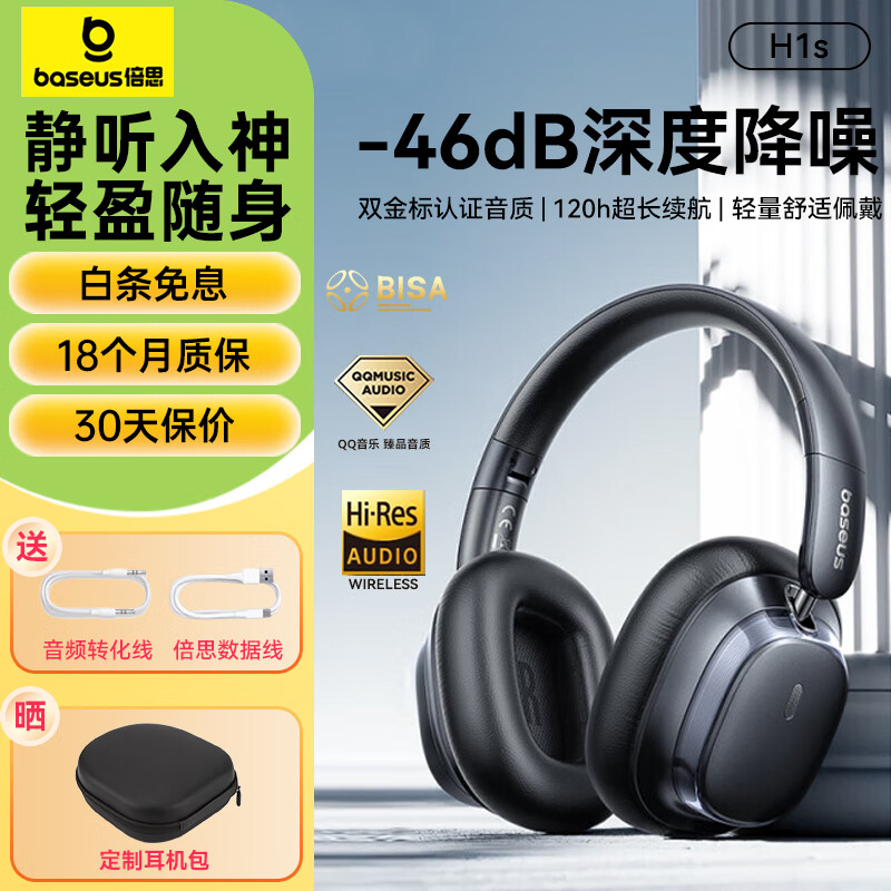 倍思(BASEUS)H1S头戴式蓝牙耳机【双金标认证】通话降噪超长续航音乐游戏电竞电脑手机适用苹果华为小米oppo H1S【 -46dB 5麦通话降噪】黑色