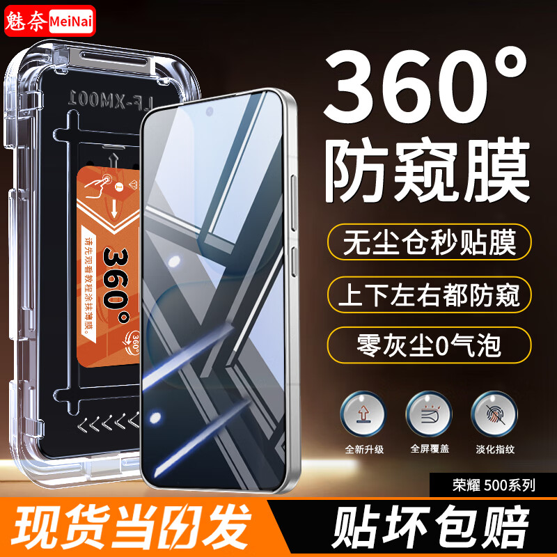 魅奈【新360度防窥】适用荣耀500/pro钢化膜荣耀500 Pro定位秒贴无尘仓上下左右防窥手机保护膜 360°四面防窥秒贴舱|1套装 荣耀500