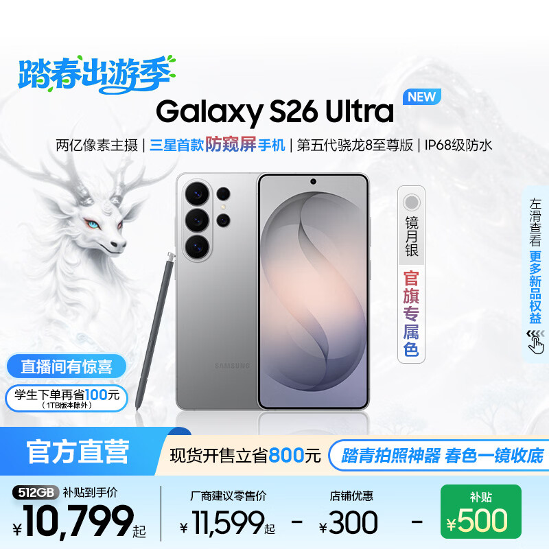 三星(SAMSUNG)Galaxy S26 Ultra 第五代骁龙8至尊版 2亿像素 AI 防窥屏 游戏 手机 SamsungCare+服务 官方旗舰店 【隽雅|镜月银】 16GB+1TB 【官方保障】加188元享1年延保