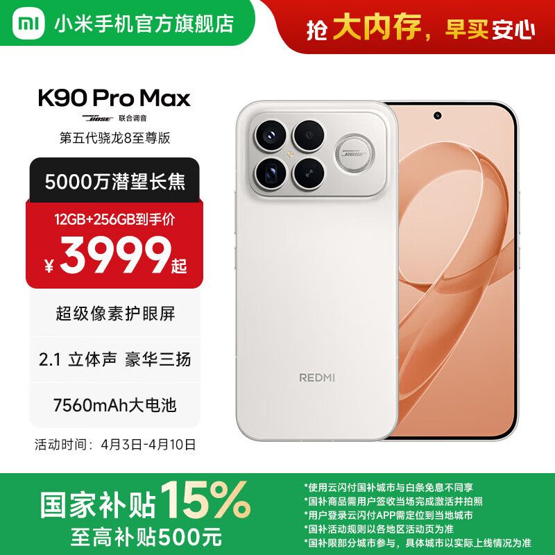 小米(MI)REDMI K90 Pro Max 6.9英寸手机 红米k90promax 5000万像素5X潜望长焦 Bose联合调音2.1立体声系统 流金白 12GB+256GB