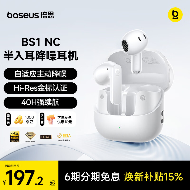 倍思 BS1NC半入耳主动降噪AI蓝牙耳机无线40h强续航舒适耳机适用于苹果华为vivo手机 礼物