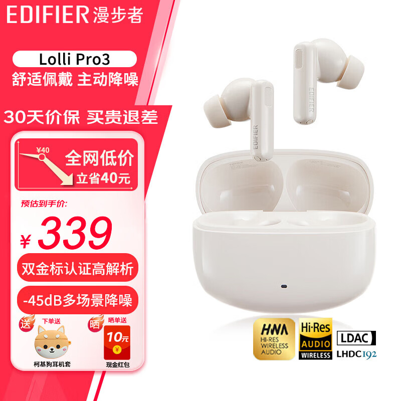漫步者(EDIFIER)Lolli Pro3 真无线主动降噪蓝牙耳机 双金标认证-45dB多场景降噪 LHDCX空间音效 兼容多手机系统 Lolli Pro3 沙滩白+柯基狗保护套