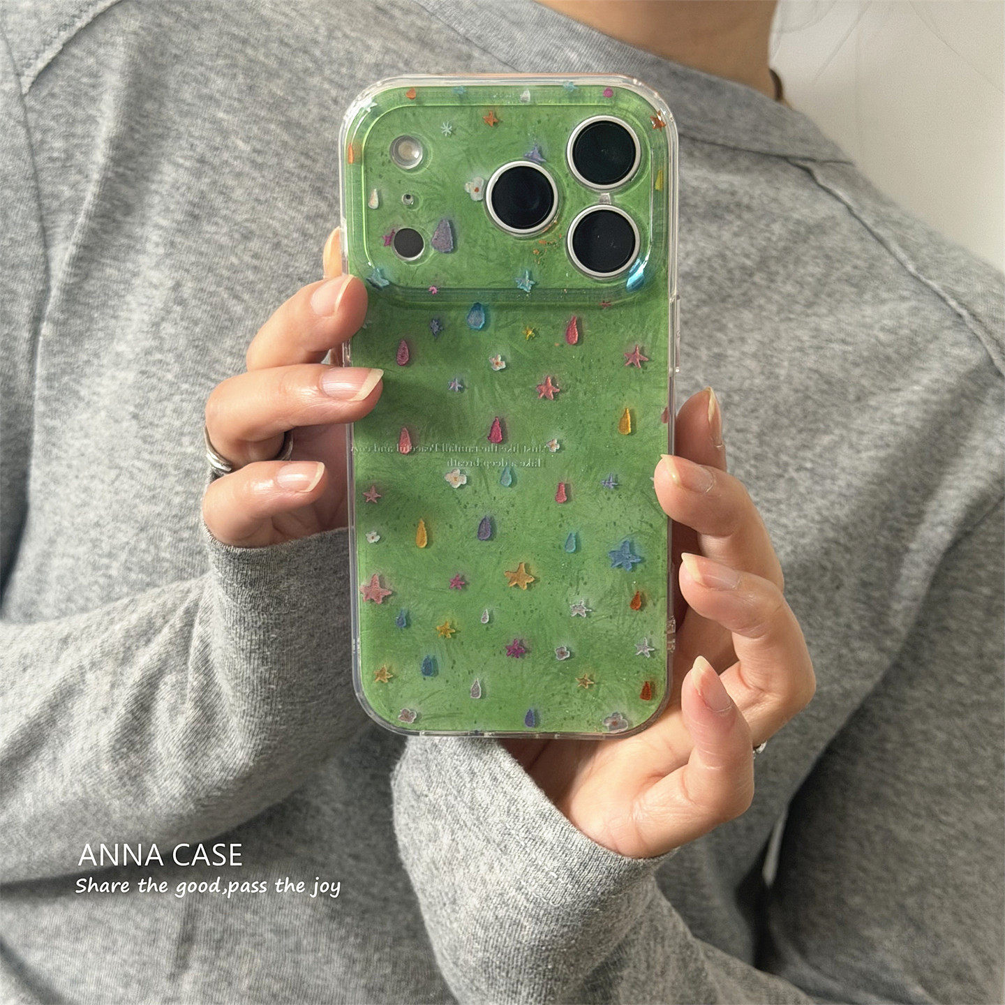 ANNACASEins少女春日绿底彩色雨滴星星手机壳适用iphone17promax苹果14软13新款15pro全包16ProMax防摔保护套
