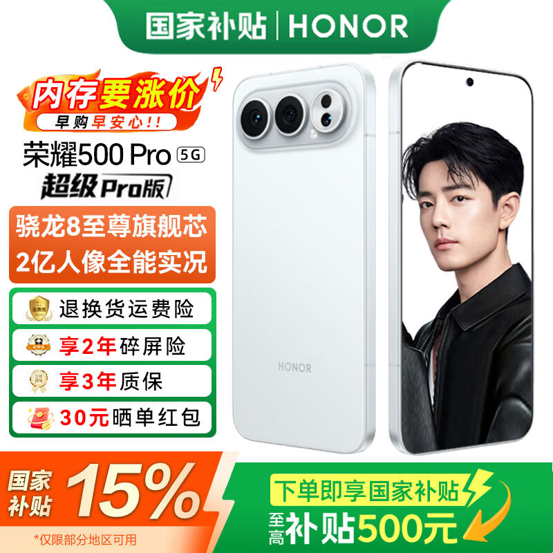 荣耀500 Pro 【肖战同款】5G手机 超级Pro版 骁龙8至尊旗舰芯 2亿人像全能实况 手机荣耀 AI手机 月光银 12GB+256GB【2年碎屏险+3年质保】 官方标配