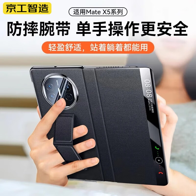 京工智造严选【隐形腕带支架】适用华为matex5手机壳x5折叠屏典藏版真素皮保护套x3智能视窗商务全包超薄防摔款 x5/x3通用【羽纱黑】腕带式*隐形支架*智能视窗