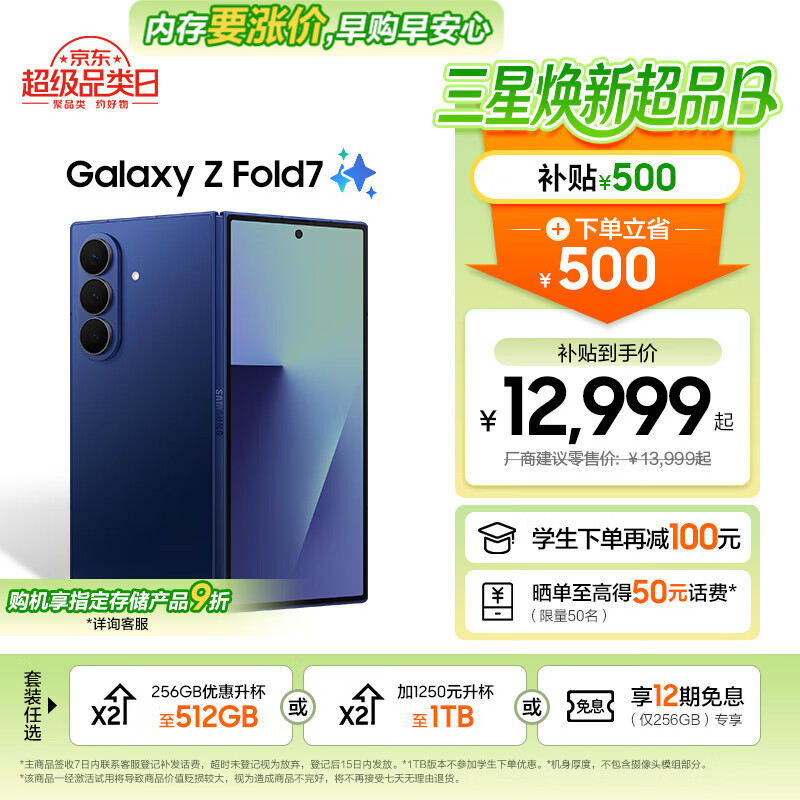 三星(SAMSUNG)Galaxy Z Fold7 轻薄8英寸大屏2亿像素主摄 视觉引擎 Galaxy AI 折叠屏手机 暗影蓝 12GB+512GB 享256GB升杯至512GB