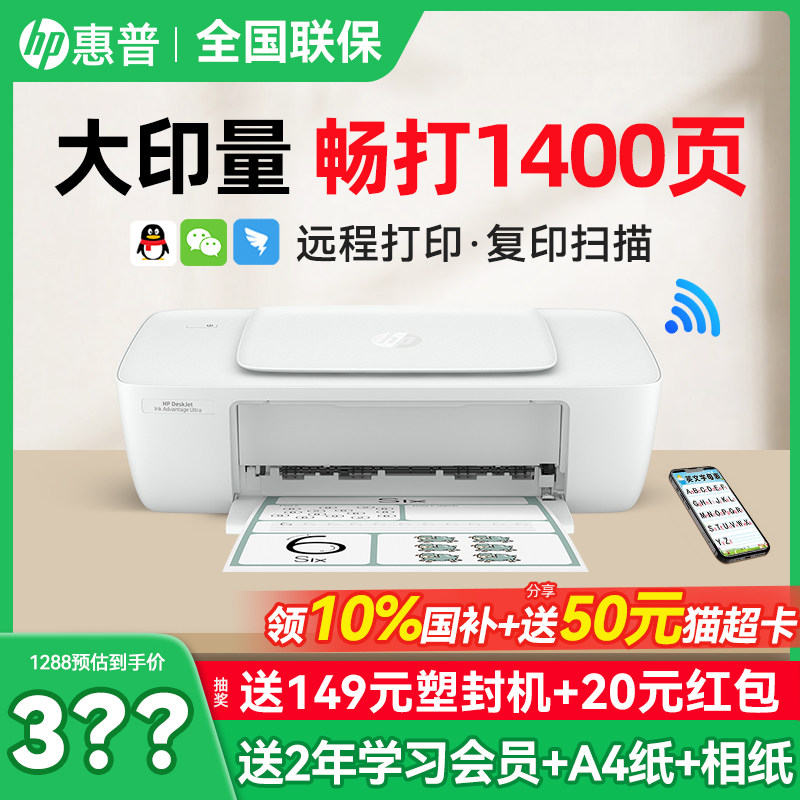 hp惠普1288彩色喷墨家用小型打印机大容量墨盒复印扫描一体可连接手机无线wifi家庭学生作业A4照片办公用1212