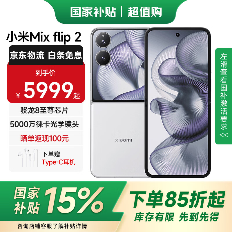 小米mix Flip 2 4.01 英寸超大外屏小米5g小折叠屏小米新品手机 贝壳白 全网通 12GB内存+256GB存储