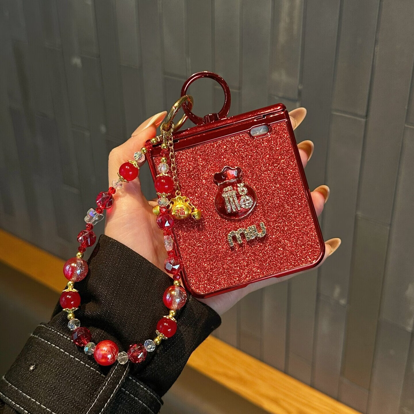 森夜适用荣耀magicvflip2手机壳新年福袋magicvflip高级红色闪粉保护套小米mixflip2指环铰链壳膜防摔 【红色miu福袋*链条】指环中轴*壳膜一体 荣耀 Magic V Flip2