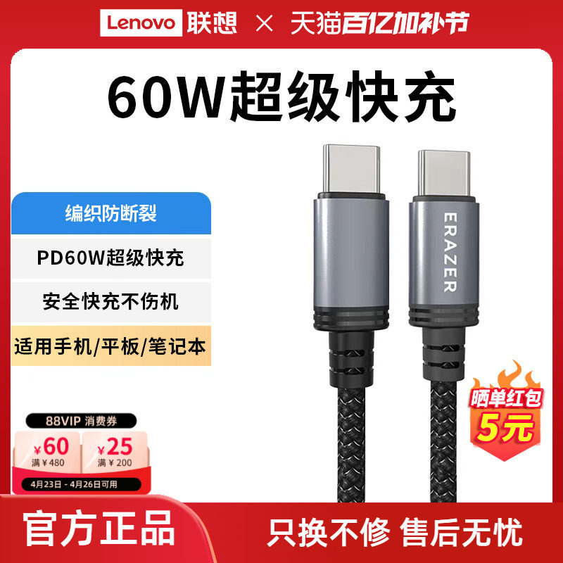 联想生态品牌异能者数据线双type-c快充线数据传输PD60W尼龙编织适用于手机平板电脑