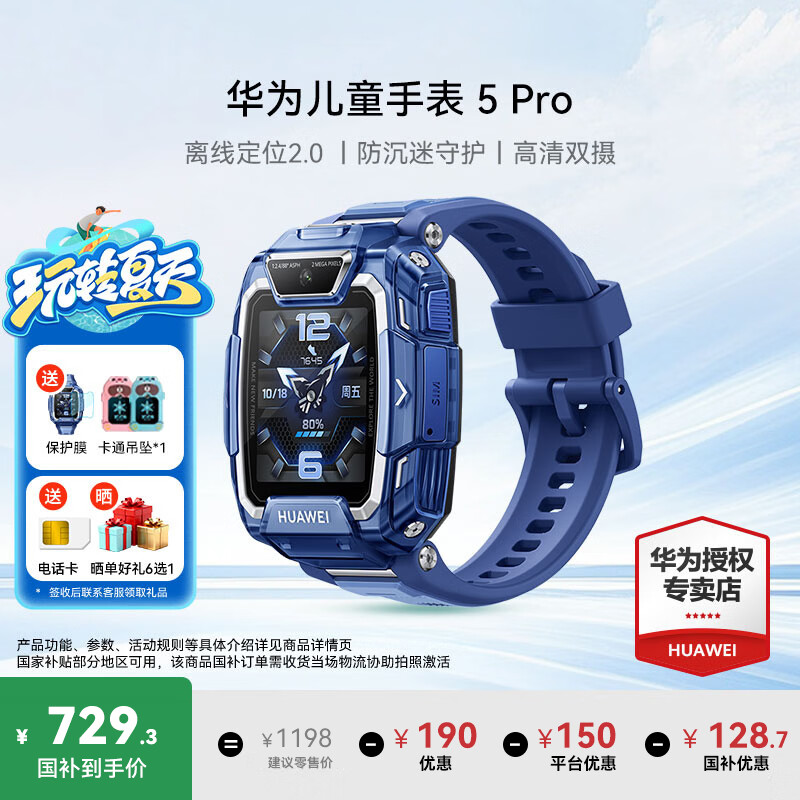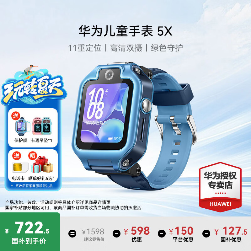 华为(HUAWEI)儿童手表5X/Pro【国家补贴15%】智能双摄拍照视频4G全网电话手表通话游泳防水学生男女孩离线朋友4 5X星际蓝【送高清贴膜*2+吊坠+电话卡】 7天无理由