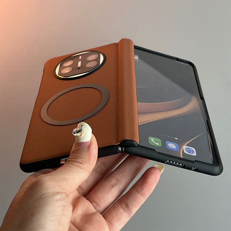 亿芯优控适用华为mateX5手机壳皮纹商务手机套机壳铰链磁吸壳膜一体超薄防摔手机壳mateX3全包高档手机壳 【棕色素皮】磁吸环+一体壳膜 华为 Mate X5