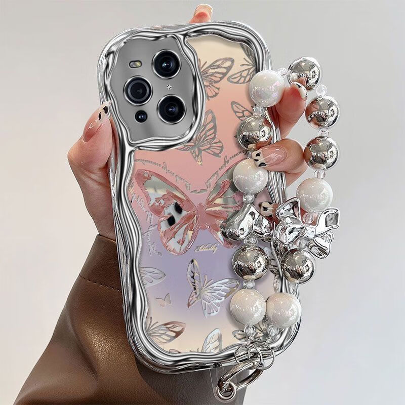 鲸赤适用oppofindx3手机壳蝴蝶pedm00电镀硅胶软opopfindx3pro保护套peem00新款0pp0finldx3pr0全包防 【电镀奶油波浪壳】镂空蝴蝶+手链 OPPO Find X3 Pro