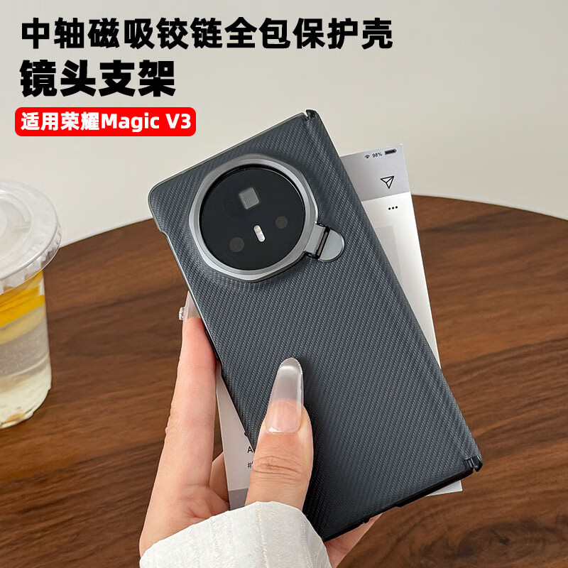 荣耀(HONOR)适用Magic V3手机壳回弹中轴潮简约商务素皮碳纤维纹镜头支架 凯夫拉纹-磁吸中轴-镜头支架款 荣耀magicV3