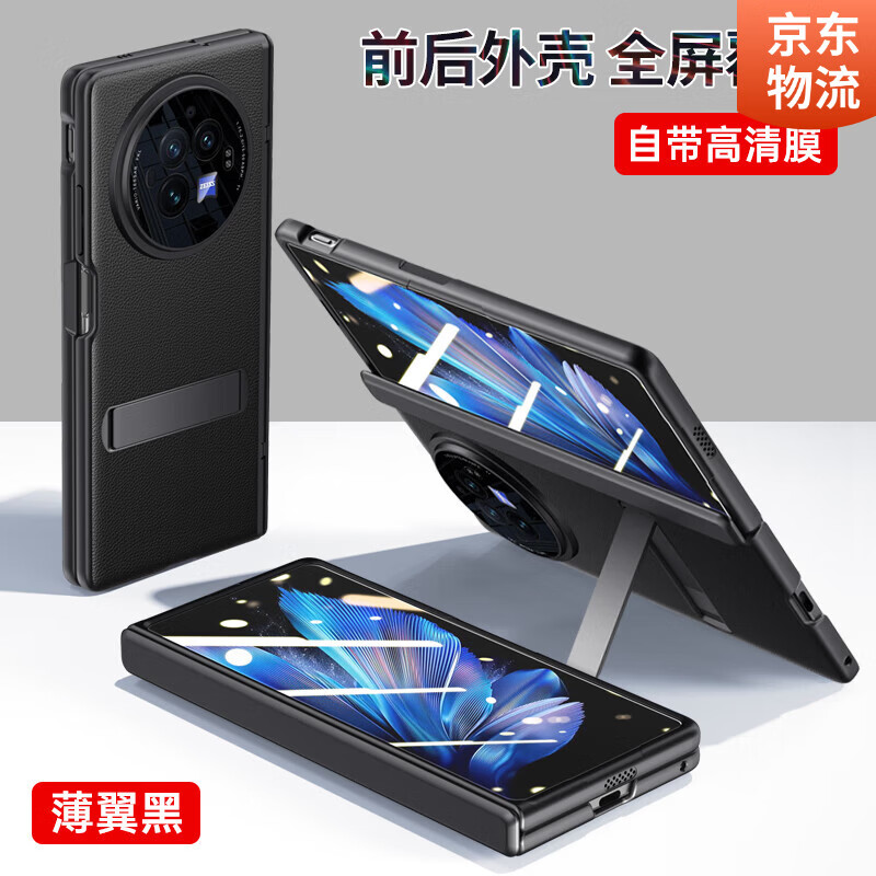 潮壳侠【壳膜一体】vivo xfold3手机壳VIVOXfold3Pro折叠屏支架保护套皮质铰链镜头全包防摔超薄透明男女 【薄翼黑】高清肤感款丨壳膜一体支架壳 VIVO X Fold3Pro