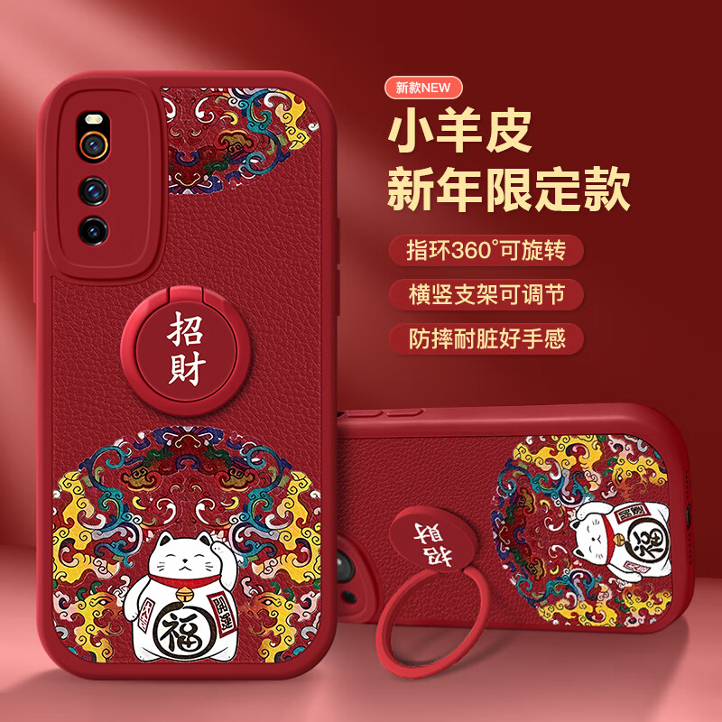画与画 适用vivoiQOONeo3手机壳国潮红色新年iQOOZ1/Neo5活力版硅胶小羊皮纹防摔Neo5s网红男女款带支架 iQOONeo5活力版【红招财猫】带支架