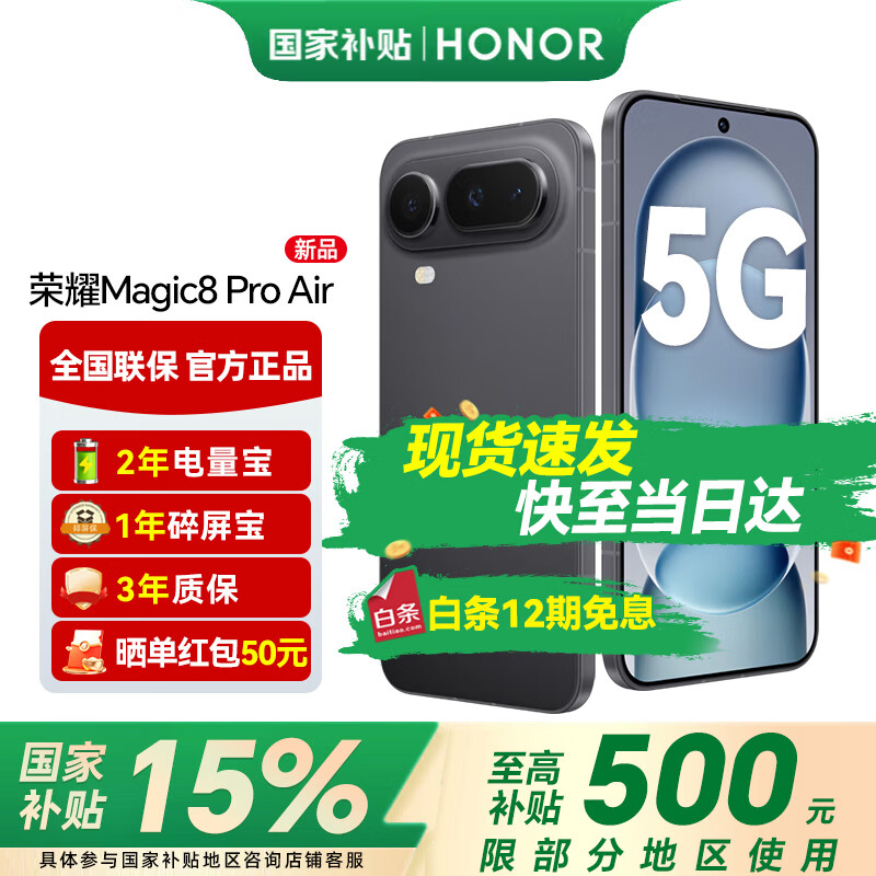荣耀Magic8Pro Air 轻至155g 薄至6.1mm 小至6.31英寸 全焦段闪光人像 新品5G手机 影黑 12GB+512GB【1年碎屏险+3年质保】 官方标配【12期免息】