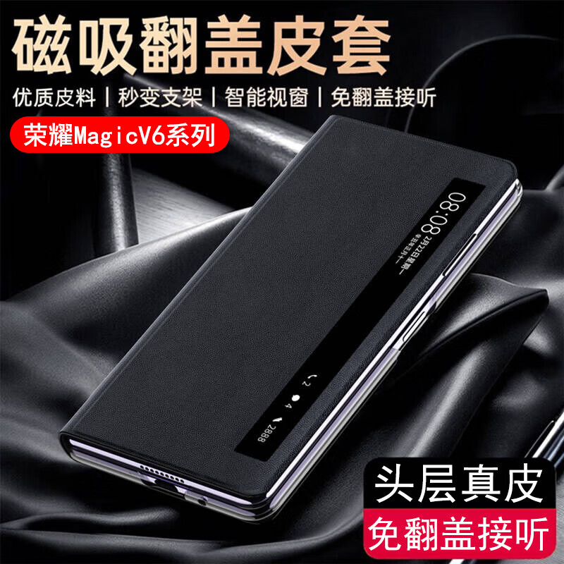 壳前线 适用荣耀MagicV6手机壳荣耀MagicV5/Vs5折叠屏全包MagicV3/Vs3商务玻璃镜面保护套翻盖式皮套 【黑色】翻盖式皮套 荣耀Magic V6